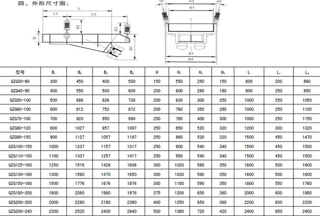 電機振動給料機設計時未考慮倉壓的影響,為保證給料機的正常運行,必須盡量減少倉壓對給料機的影響。因此在設計溜嘴時,應用溜嘴的后側板承擔料柱的垂直壓力。溜嘴形式及配置尺寸可參考圖及表中數值。